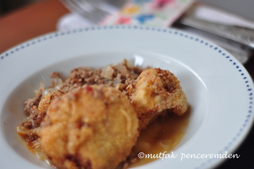 Kıymayı tavla zarı gibi kestiğim soğanla hafifçe pembeleştiriyorum. Biraz su azıcık salça, ‘sadece rengini değiştirecek kadar’ ekliyor iyice pişiriyorum. Tuz ve karabiberle tatlandırıyorum. Karnabaharı çiçek çiçek ayırıyor sonra tuzlu suda sadece on dakika dağılmadan kadar kapağı kapalı olarak haşlıyorum.Süzdükten sonra önce iyice çırpılmış yumurtaya sonra da galeta ununa bulayıp bol yağda kızartıyorum.