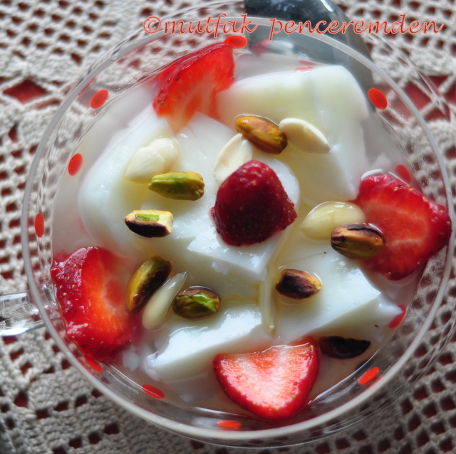Servis yaparken tabağa önce şerbet sonra küp kesilmiş muhallebileri ve sonra meyveleri ekliyorum.