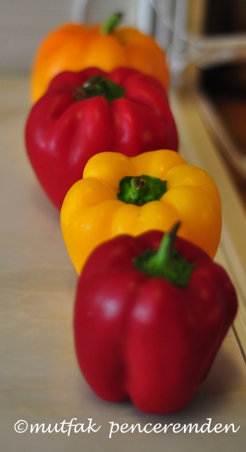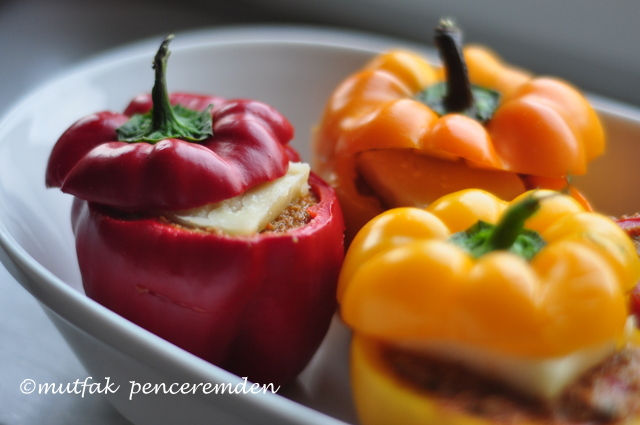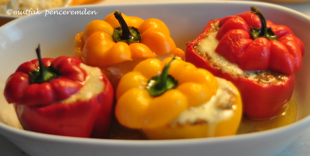 Kıymam bir kenarda beklerken sıra biberleri hazırlamaya geldi. Biberleri kaynamakta olan tuzlu suyun içine atıp yaklaşık beş dakika haşladım,ocağı söndürdüm ve beş dakika da bu şekilde beklettim.Amacım biberlerin kabuğu ayrılmadan yumuşamalarını sağlamaktı.Ardından biberleri soğuk suya attım ki renklerini ve diriliklerini kaybetmesinler. Biberlerin kapaklarını şekilde görüldüğü gibi ayırdım ve soğumalarını bekledikten sonra içlerini kıyma harcımla doldurdum. Kapaklarını kapatmadan önce dolmanın üzerini örtecek şekilde birer parça eski kaşar peyniri koyup kapakları kapattım.