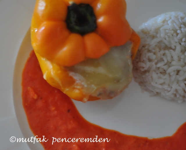 Fotoğrafta da görüldüğü gibi tabağa biberi yerleştirdikten sonra sosunu yanına döktüm ve beyaza pilav ile birlikte servis yaptım.Orijinalinde de garnitür olarak pilav vardı ve pek yakışmıştı.