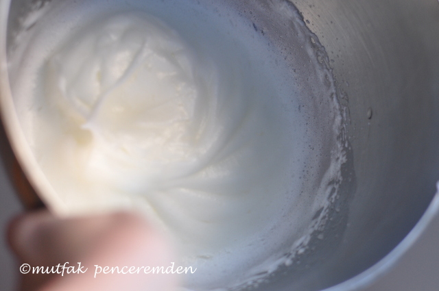 Mereng için yumurta beyazlarını bir fiske tuzla kaskatı olacak şekilde mikserde çırpıyorum.Koyulaşınca pudra şekerini katıyorum.