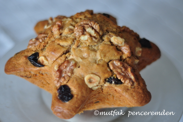 Yağlanmış unlanmış kalıba döktükten sonra üzerine kalan ceiz,fındık ve diğer kuru meyvelerle süs yaptım. 45-50 dakika kadar ön ısınmış fırında pişirdim. Ortasına kürdan batırıp kuru olduğunu gördükten sonra piştiğine emin oldum.