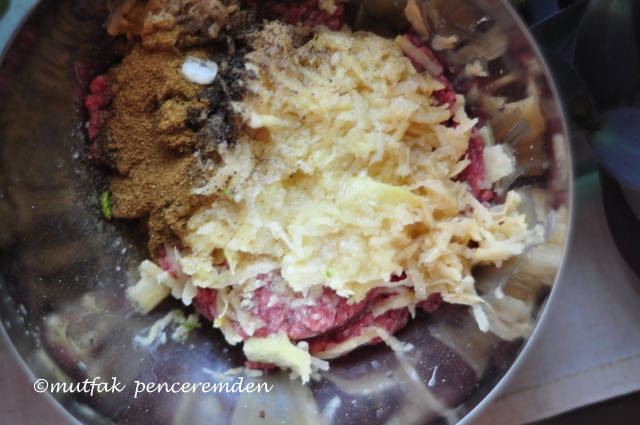 Kıymayı derin bir kaba alıyorum. İçine patatesleri çiğ olarak rendeliyorum. Bunun için rendemin orta kalınlıktaki kısmını kullanıyorum.