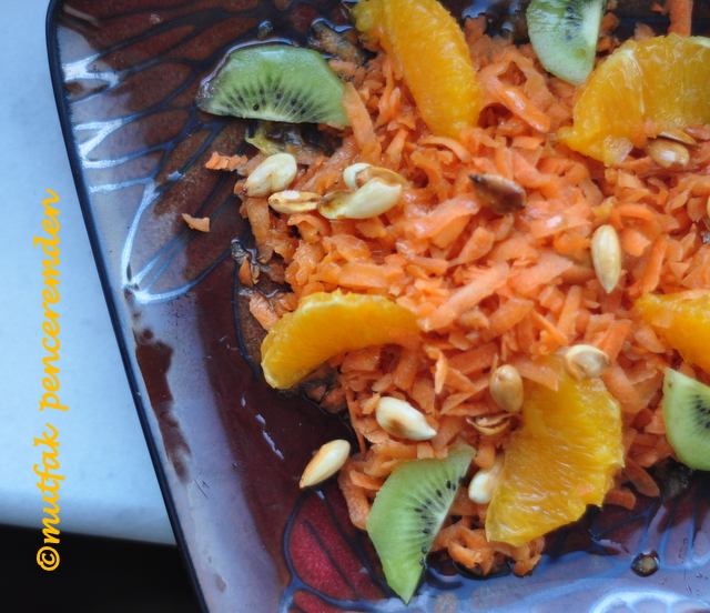 İnsanın içini ferahlatan, turuncu, tupturuncu bir salata bu. Daha önce bir de kırmızı salata tarifi vermiştim. Onda da havuç rendesi vardı ve yanında salataya renk veren pancar kullanmıştım. Bu salatam diğerinden çok daha basit. Gerek kolay yapılışı gerekse içerdiği vitaminlerden dolayı sıkça tercih edebileceğiniz bu tarifi sözü uzatmadan vereyim.