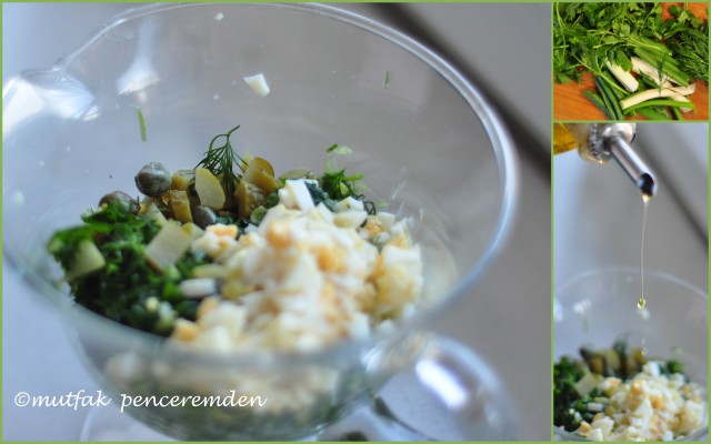 Taze soğan,dereotu,maydanoz ve kornişonları bıçakla kesebileceğim en minik şekilde kesiyorum. Katı haşlanmış yumurtayı da incecik kıyıyor yeşilliklere katıyorum.Limon kabuğu rendesi, limon suyu, elma sirkesi tuz, biber zeytinyağı ile karıştırıyorum ve biraz da kapari ekledikten sonra kuşkonmazların üzerine sosumu döküp iyice kızarmış ekmekle servis yapıyorum .