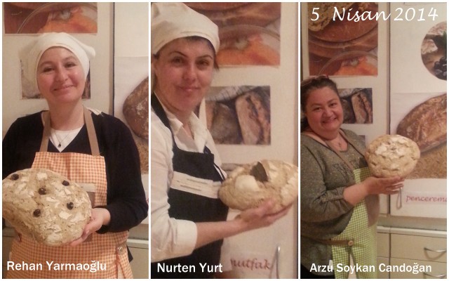 *Yazı Evi arkadaşlarım arasında kura çekmiştik yılbaşı kutlamamızda. Benim armağanım şanslı arkadaşlarımı ekmek atölyeme davet etmekti. O gün bugün, yok taşınma telaşı, araya giren gripler, mazeretler derken dün kendileriyle biraraya gelebildik.Ortak konumuz okumak ve yazmak olunca ellerimiz hamurda aklımız kitaplardaydı.Kara Kitap’ı aklayamadık henüz ama üstümüzü başımızı bir güzel akladık doğrusu.”Öyküye Giriş” dersimizde tartışmaya fırsat bulamadıklarımızdan” Hayatım Roman” yazı dizimize kadar sohbet etmeye dalınca arkadaşlar ekmeklerini fırına sürdüklerini unutuverdiler.Çalar saatin sesiyle yerlerinden fırladılar,ekmeklerini yanmaktan kurtardılar.Çay soframızda yedikleri bazlamaları çok beğenince”Haydi bazlama da yapalım” demesinler mi?Sandım ki işe girişecekler. Yok canım. nerede?Bizim emektar Kitchenaid şipşak hamuru yoğurdu,ılık fırın mayalandırdı, sonra da ben ocağın başına geçtim pişirdim. Bizimkilere alıp götürmesi kaldı. Ohhhhh afiyet şeker olsun.Şu fotoğraflara bakınca yüzlerindeki mutluluğa siz de şahit olabilirsiniz.Arkadaşlarım kendi ekşi mayalarını doğurdular,onlara isim verip beslemeye başladılar bile.
