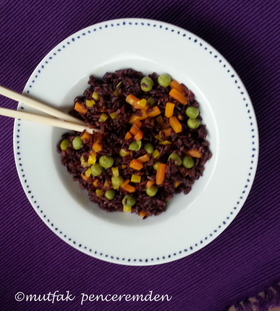 Ben bugün size adı” purple brown” “morumsu kahverengi” olan bir pirinçten yaptığım pilavı tarif edeceğim. Bu da siyah pirince örnek bir tür. B,r yurtdışı seyahatimde satın almıştım, şimdi benzer çeşitleri büyük marketlerde bulunuyor. Bu pirinçler alıştığımız beyaz pirince göre daha fazla su çekiyorlar ve pişirme şekilleri de farklı oluyor.
